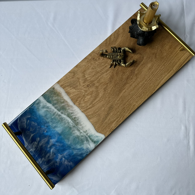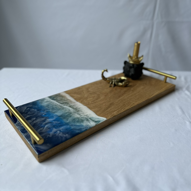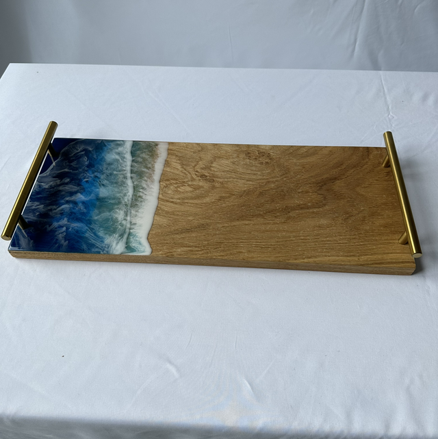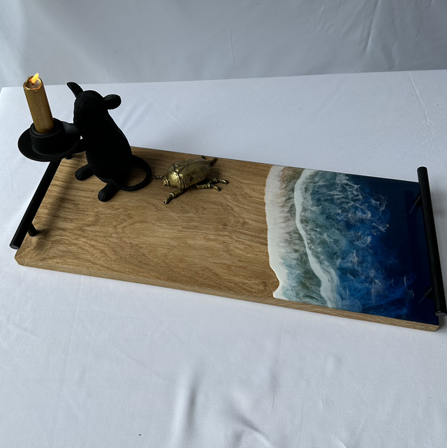 Handgemaakte dienblad van eikenhout en epoxy. Het eikenhout is 2cm dik afgewerkt met een olie. Door de Epoxy op een speciale manier over het dienblad te gieten is er een oceaan look gecreëerd.