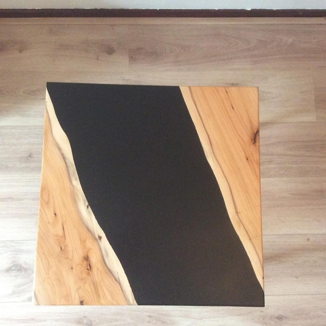 Bijzettafel/salontafel van 2 cm massief Taxus hout met zwarte epoxy. Het blad is afgewerkt met een Osmo Hardwax olie.