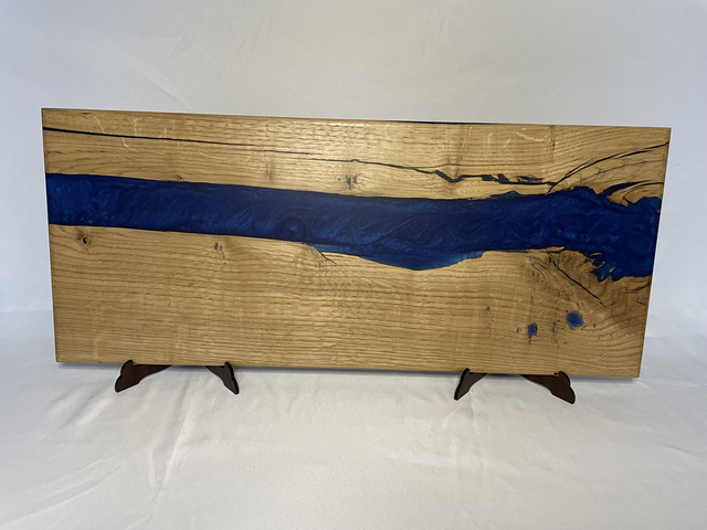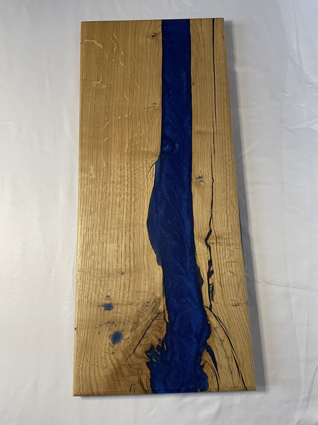 Serveerplank gemaakt van massief eikenhout en epoxy en afgewerkt met een olie.