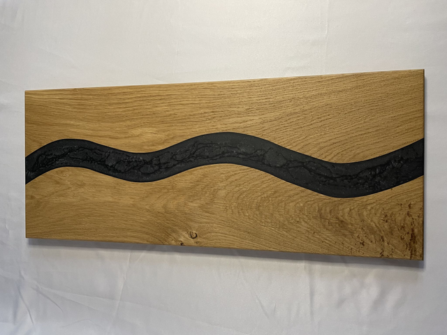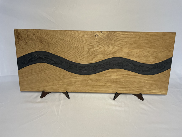 Serveerplank gemaakt van massief eikenhout en epoxy en afgewerkt met een olie.